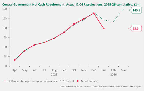"On inspection, whilst tax receipts did surprise to the upside that wasn’t the main story. Really more of the news was from government spending being lower than expected," says Lloyds Bank, explaining: