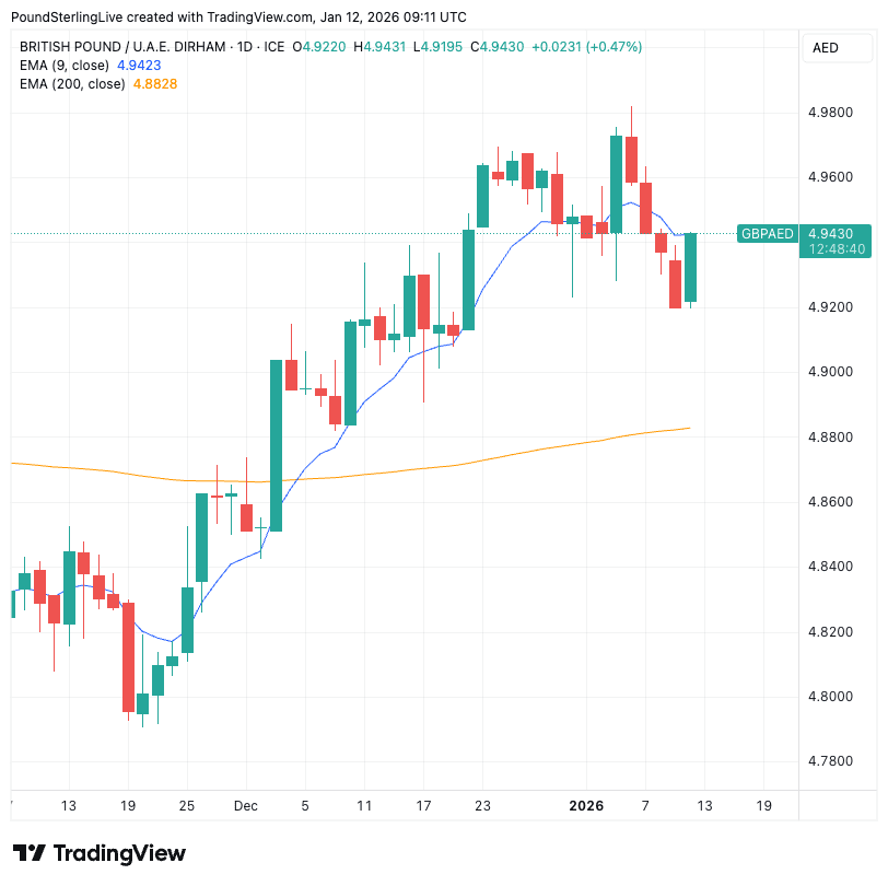 The pound to dirham exchange rate (GBP/AED) rises to 4.9419, a daily gain of 0.45%, and we forecast a constructive week of trade ahead.
