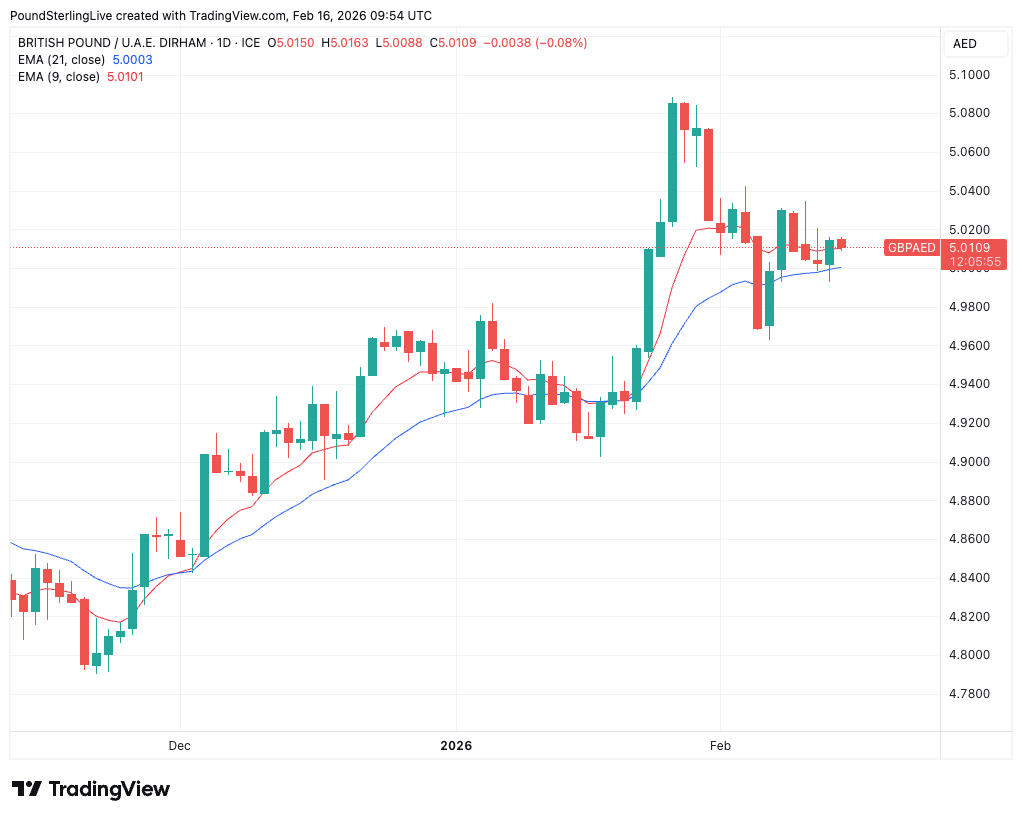 GBP/AED opens around 5.0150, placing it near the midpoint of last week’s range and comfortably above the psychologically important 5.0 handle.