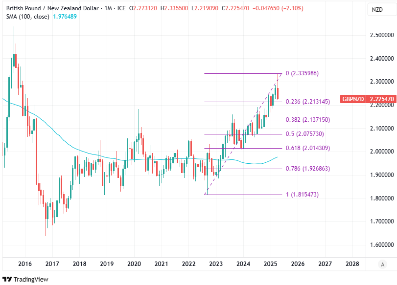 Above: GBP/NZD shown at monthly intervals with Fibonacci retracements indicating possible areas of technical support. Click for closer inspection.