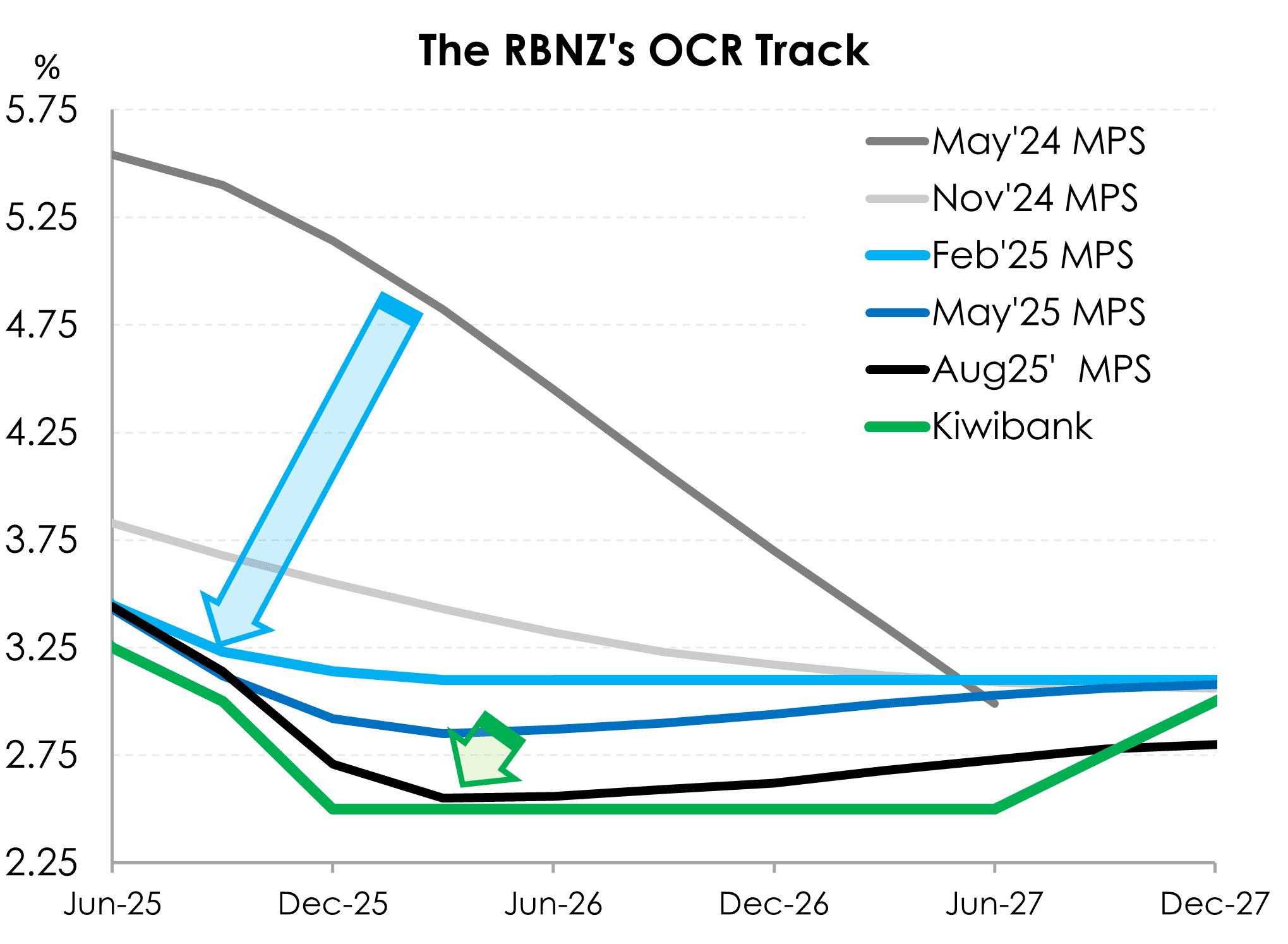 Image courtesy of Kiwi Bank. Image shows the RBNZ has significantly lowered its own expectations for the future outlook of the OCR.