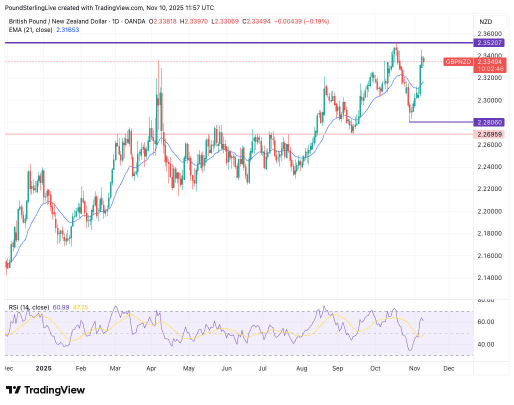 GBP/NZD touched a low of 2.2806 on October 29, from where it found a base and rallied, recording seven consecutive daily advances.