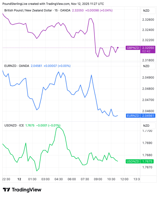 - The New Zealand dollar is 0.80% stronger against the pound this week, pressing GBP/NZD lower from 2.3397 to 2.3196.