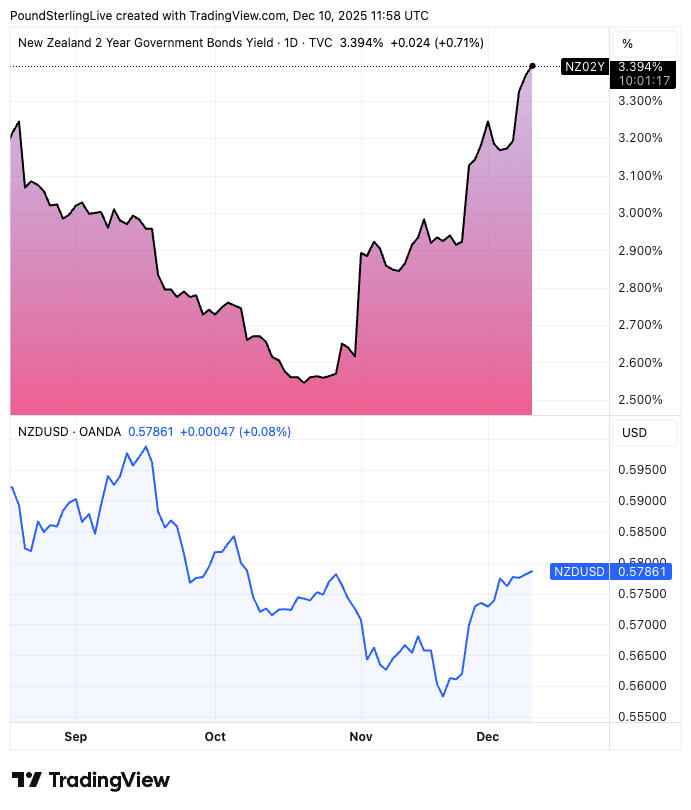 Above: Two-year yield on NZ government bonds (top panel) are rising, and taking the Kiwi along.