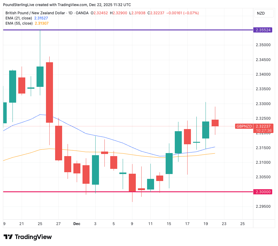 The pound to New Zealand dollar exchange rate (GBP/NZD) rose to 2.33 last Friday, but has since pared that advance to 2.3200 at the time of writing Monday.