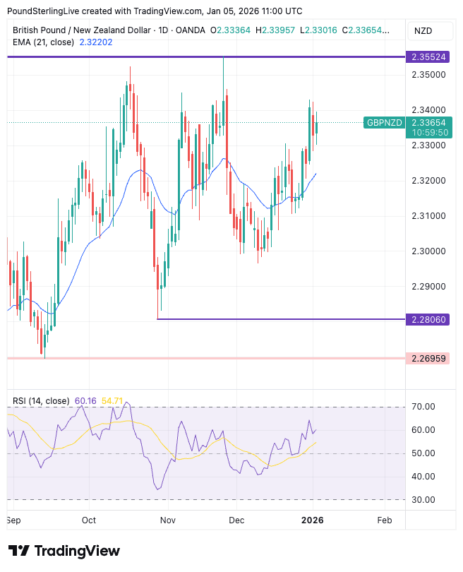 The pound to New Zealand dollar exchange rate (GBP/NZD) rises to 2.3364 on Monday, putting the 2025 peak at 2.3552 back in contention.
