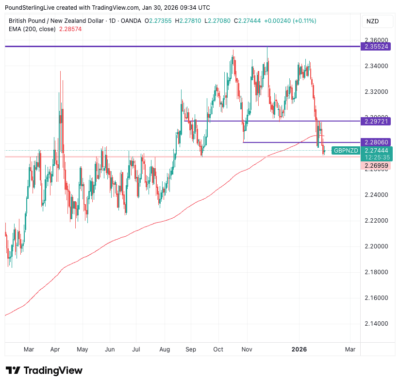 GBP/NZD fell to 2.2726 on Friday, leaving the pair down around 1.0% on the week and on course for a third consecutive weekly loss as momentum turns in favour of the New Zealand dollar.