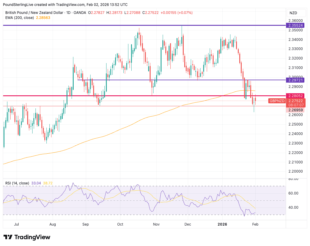 A key technical shift occurred last week when GBP/NZD fell below its 200-day exponential moving average, an indicator widely used to distinguish between medium-term uptrends and downtrends.