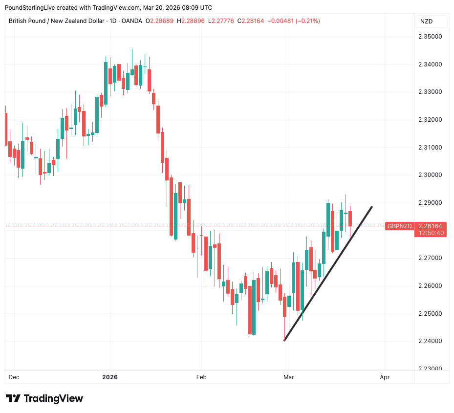 The pound-New Zealand dollar rate looks set to record a down week, but the overall trend still remains higher in the short term as the March recovery, aided by the war in the Middle East, lifts UK interest rate expectations more rapidly than elsewhere in the G10 space.
