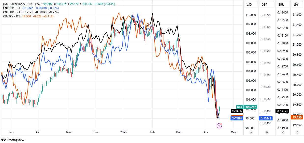 Both currencies have fallen broadly since the White House’s “Liberation Day” tariff announcement prompted a tit-for-tat exchange of tariff measures, which reached a crescendo last Friday when the Ministry of Finance in Beijing added an additional 34% to its levy on imports from the US, taking the total tariff to 125%.