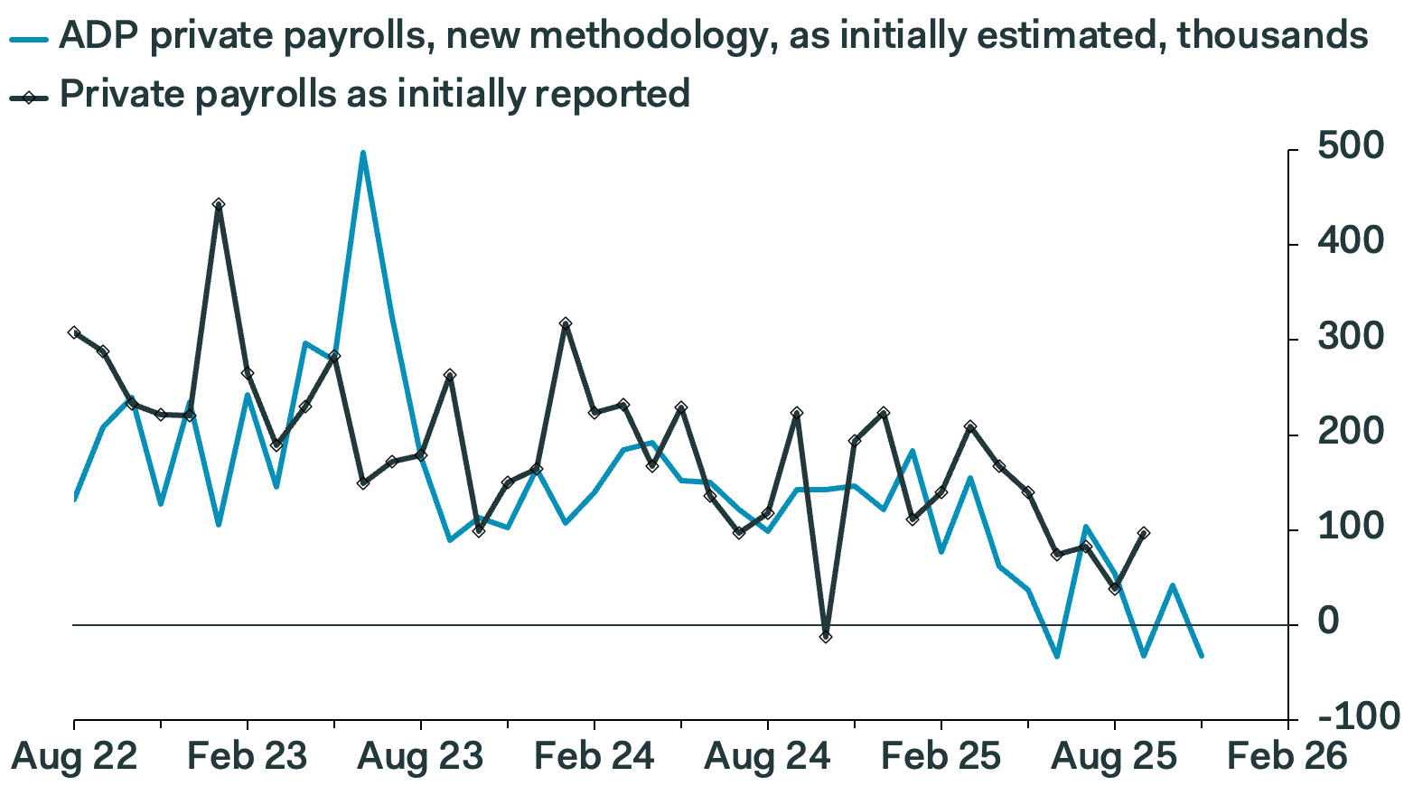 Since the month of June (-23k), ADP has only reported job gains in the months of July and October, with Wednesday's print being the 2nd-worst since June 2020.