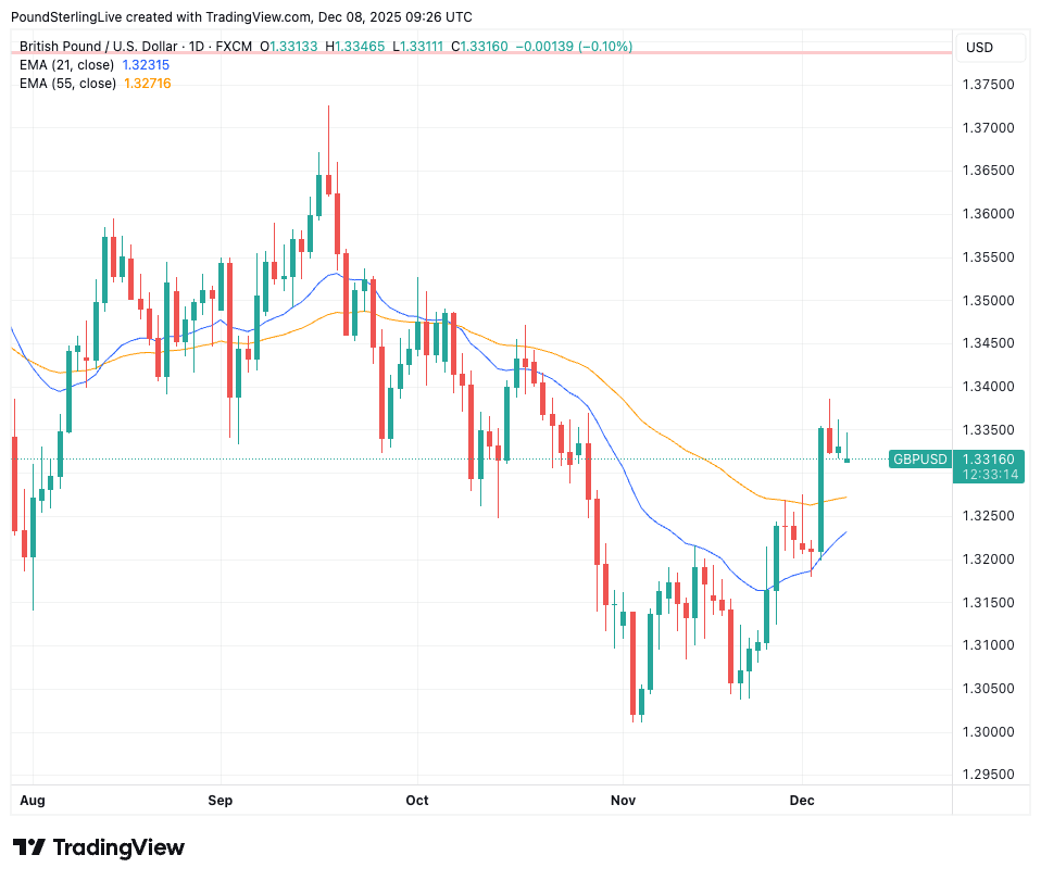 Above: GBP/USD at daily intervals showing a break above the 21- and 55-day exponential moving averages.