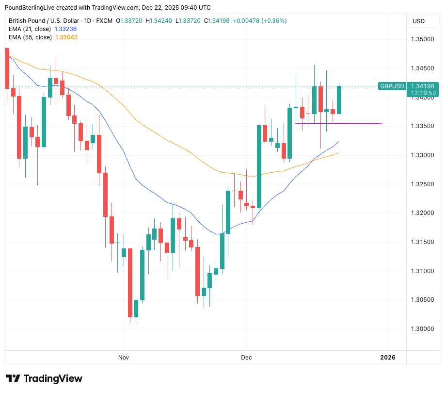 However, with momentum still positive, we think we can see that resistance fading in the coming days, allowing for a couple of daily closes above here, and we are forecasting a move to 1.3450.