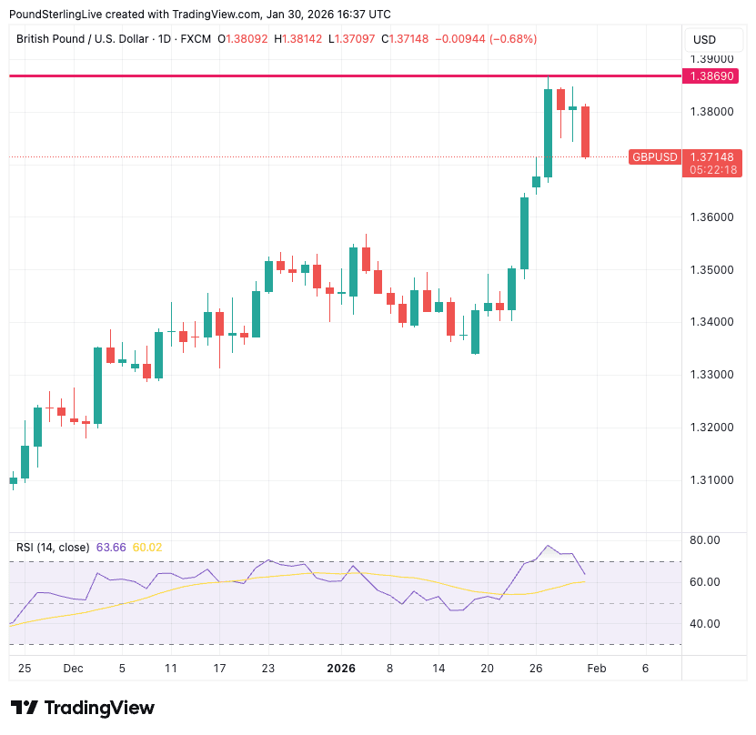 On Tuesday, the pair hit a new four-year high at 1.3869 and faltered, triggering an unwind of overbought conditions. The dollar recovery builds some momentum into the weekend on confirmation of the appointment of Kevin Warsh to the position of Chairman of the Federal Reserve.