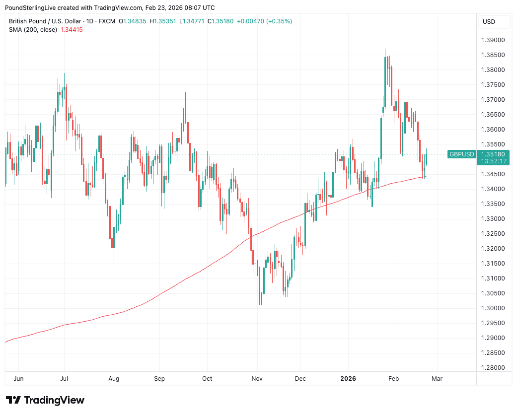 The pound to dollar exchange rate (GBP/USD) rises to 1.3521 on Monday, a solid 0.45% advance from the day's opening level, amidst uncertainty as to the outlook for U.S. tariff policy.