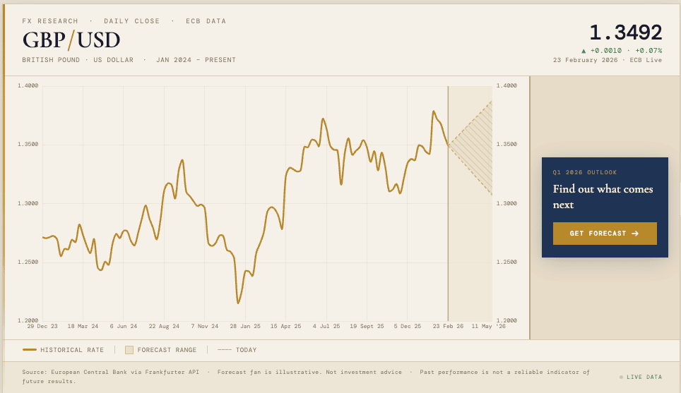 GBP/USD trades at 1.3447 at the time of writing, putting it on course to achieve the Q1 median forecast made by over 30 of the world's leading financial institutions surveyed by Pound Sterling Live on behalf of Horizon Currency.
