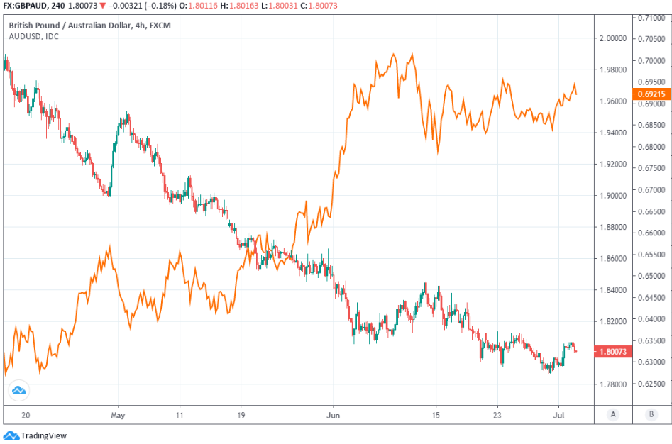 Above: Pound-to-Australian Dollar rate at 4-hour intervals with AUD/USD (orange).