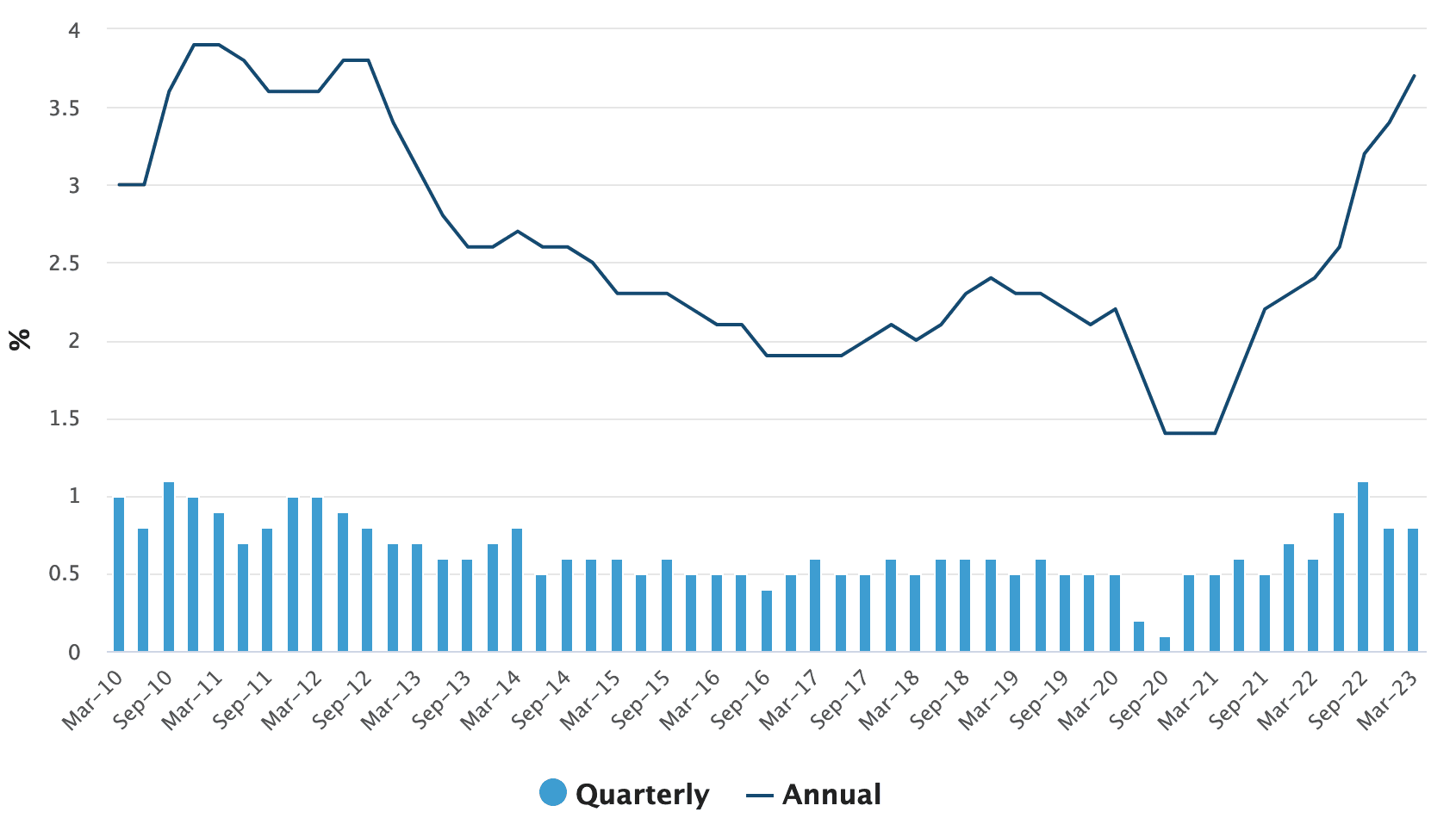 Private sector wages rose 0.8% in Q1, down from 0.9% in Q4 2022 and 1.2% in Q3. Public sector wages rose 0.9% in Q1, up from 0.8% in Q4 and 0.6% in Q3.