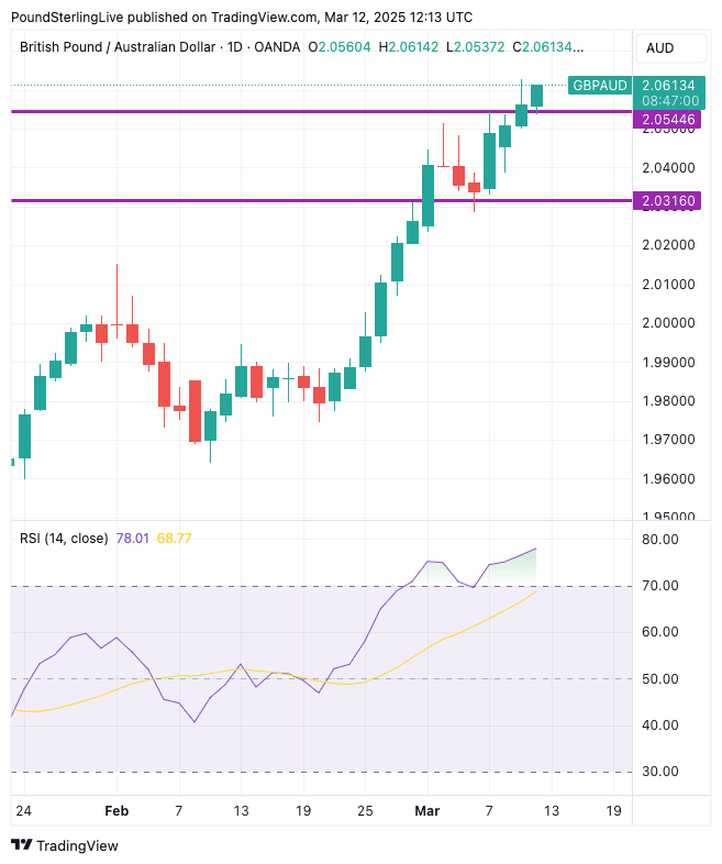 The climb takes GBP/AUD further into overbought territory, with the Relative Strength Index reading at 77.85, levels last seen in July 2024.