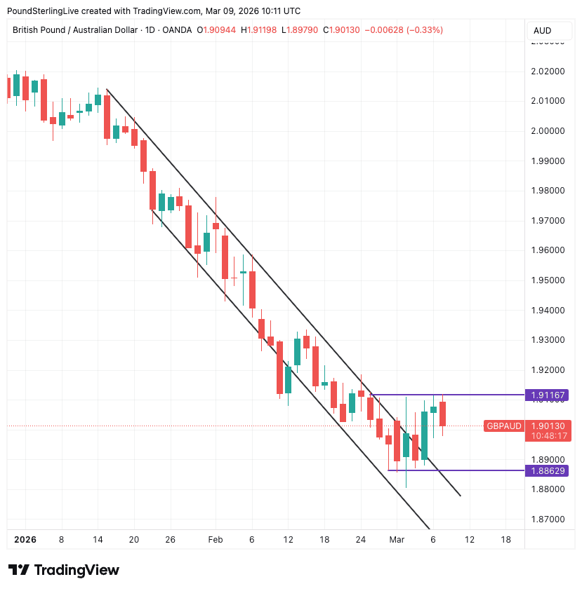 With AUD finding favour in this environment, GBP/AUD drops a third of a per cent on Monday to 1.9015.