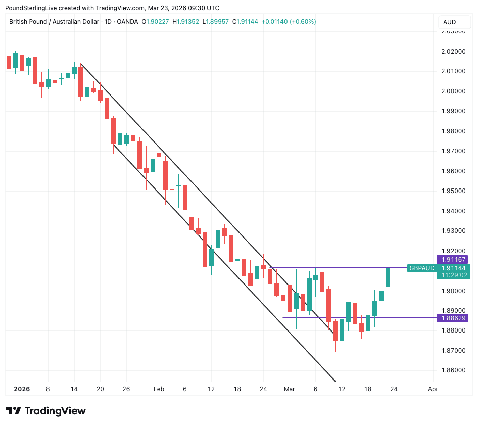 The pound is looking to record a fourth consecutive daily gain against the Australian dollar, a sign that downside momentum has been arrested.
