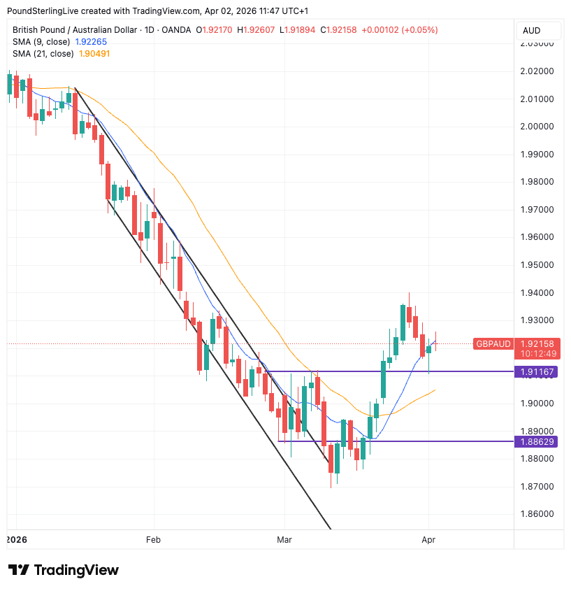 Technical support at 1.9116 is holding and the fundamental picture – fading AUD rate appeal, extended war timeline – favours sterling. The initial upside target is 1.94. Those with AUD payments pending can set a rate order to capture a move toward that level without having to watch the market continuously.