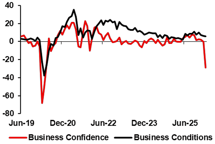 Confidence fell 29pts to -29, the second largest monthly fall in the survey’s history, while current assessments of business conditions remained stable at 6.