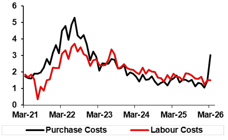 "The economy had carried a healthy level of momentum heading into the unfolding shock," says Michael Hayes, Economist at NAB. "The forward orders measure fell 6pts to -1 index points, erasing the gains made so far through 2026 and possibly reflecting rising uncertainty."