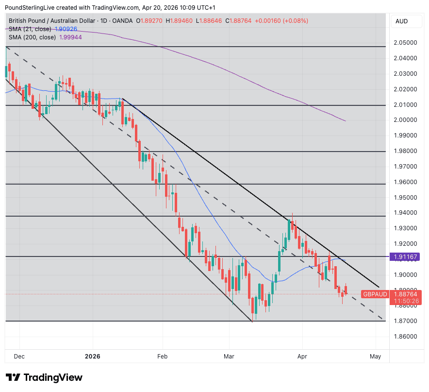The pound-Australian dollar exchange rate is poised to extend its downtrend and test the 2026 low at 1.87.