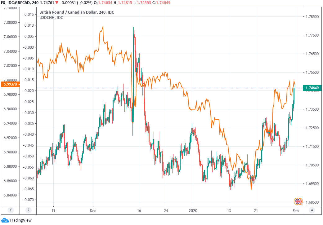 Above: Pound-to-Canadian Dollar rate at 4-hour intervals, rising alongside USD/CNH rate.