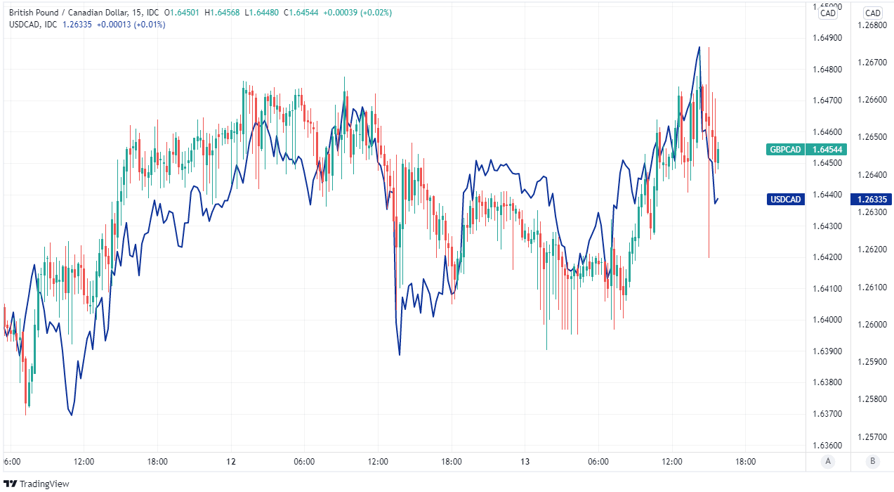 Above: GBP/CAD shown at 15-minute intervals alongside USD/CAD.