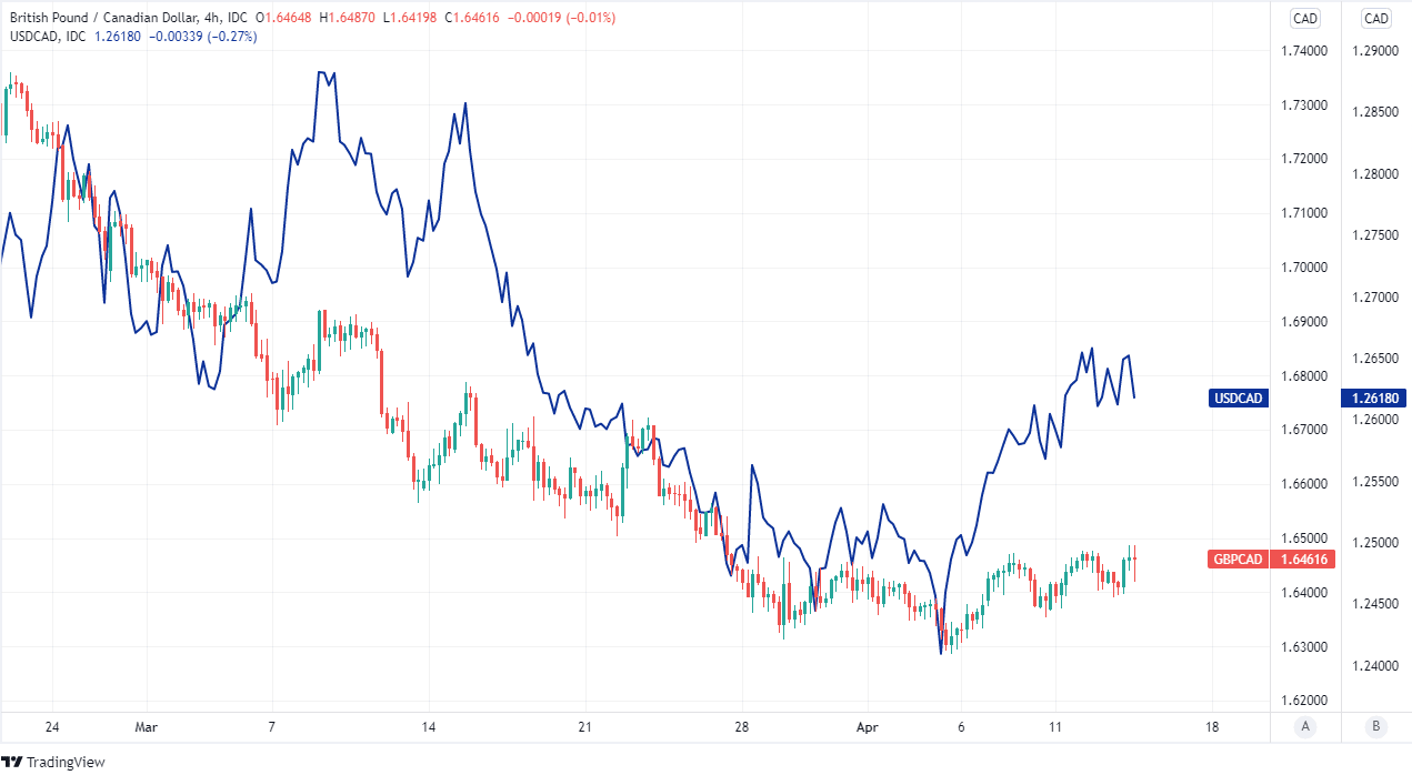 Above: GBP/CAD shown at 4-hour intervals alongside USD/CAD. Click image for closer inspection.