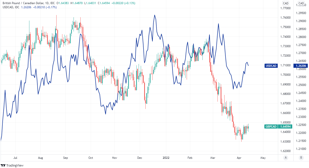 Above: GBP/CAD shown at daily intervals alongside USD/CAD. Click image for closer inspection.