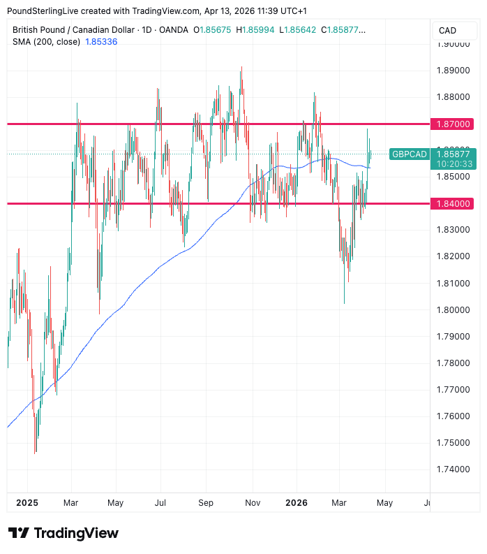 The daily chart shows the pair has spent the majority of the past year between 1.84 and 1.87, with moves out of these tramlines quickly pared by a mean reversion. This speaks of a strong equilibrium in the GBP/CAD rate that's proving difficult to shake under the current FX market regime.