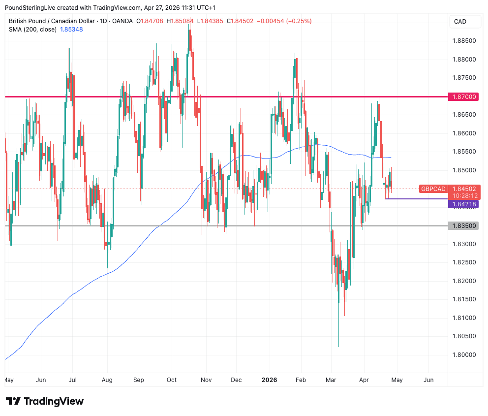 GBP/CAD is under pressure at 1.8448, which puts it on course for the previous week's lows at 1.8421, which has established itself as a near-term support zone.