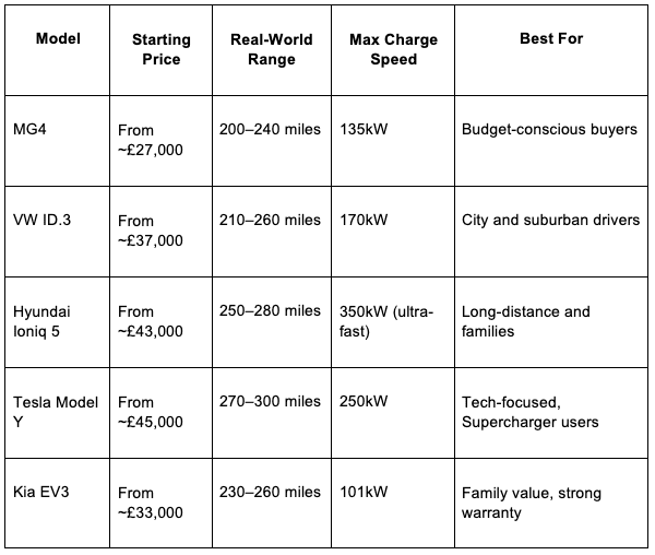 Range matters, but do not chase the biggest number on the page. The average UK driver covers just 20 miles a day, so a real-world range of 200 miles covers most people comfortably. Spend the extra money on faster charging instead.