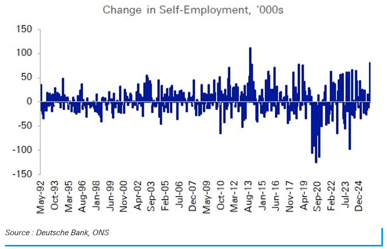 "Job gains came from self-employment. If we look at the number of employees from the LFS, there was a 63k drop in the 3m to Feb-26. So what happened? The number of self-employed rose by a whopping 81k. Across the entire data series (going back to May 1992), this marked the SECOND LARGEST self-employment increase on record."