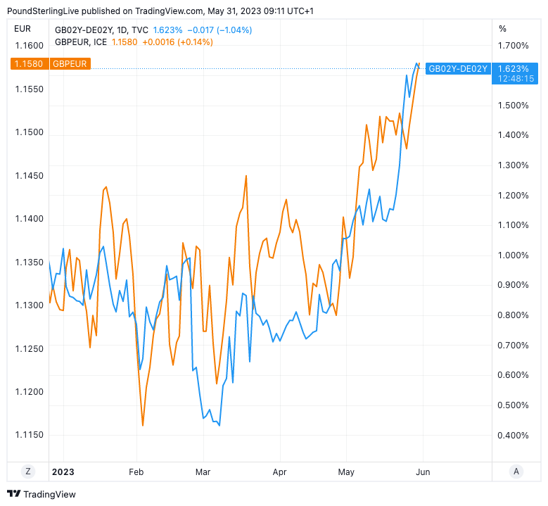 The above chart shows the UK two-year bond yield minus the German two-year bond yield, plotted against GBP/EUR (left column).