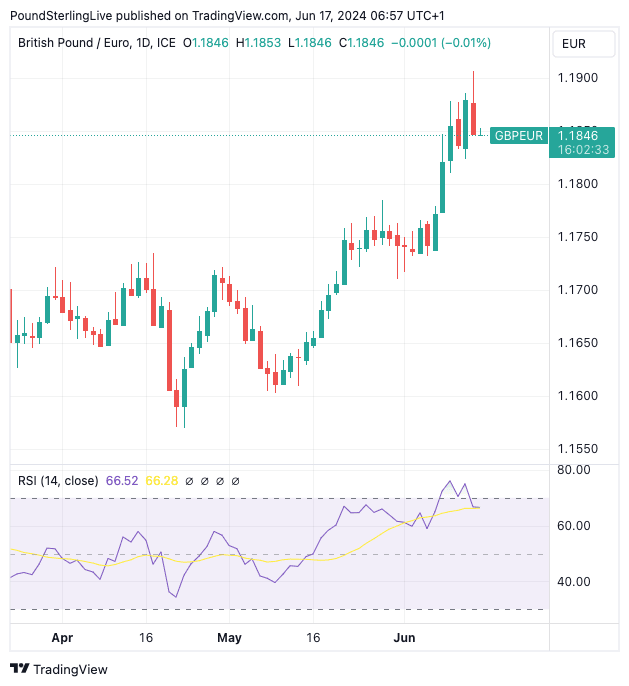Above: GBP/EUR at daily intervals with the RSI in the lower panel. Track GBP/EUR with your own alerts, find out more here.