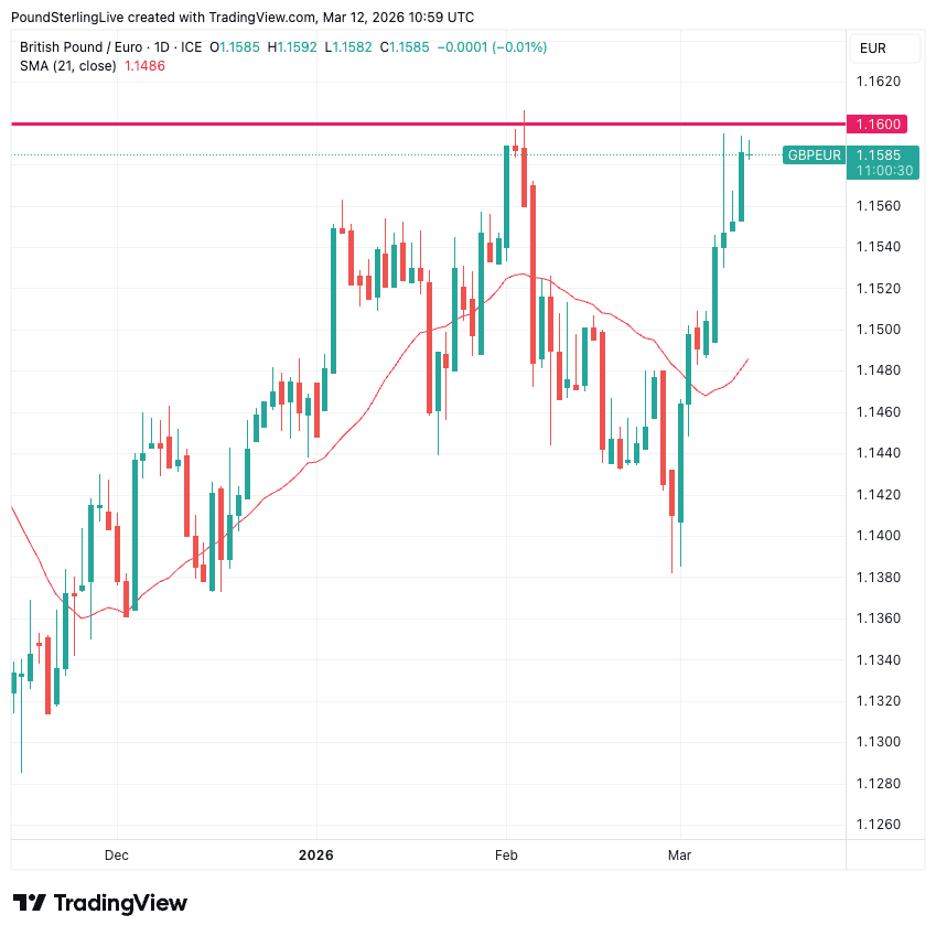 Pound sterling's rise against the euro reaches a potential ceiling.