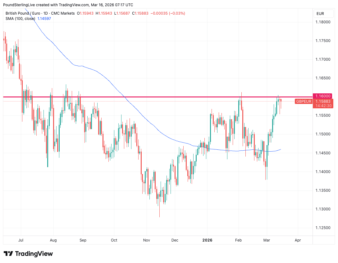 The GBP/EUR exchange rate trades just below the crucial 1.16 barrier at the time of writing Monday, a level that has frustrated the March recovery over the previous three trading days.