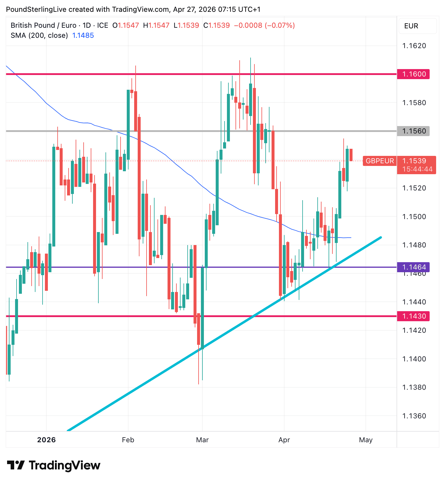 1.1560 is, in fact, the start of a resistance zone that leads up to the big-figure 1.16 level, where the year's highs are located and where GBP/EUR struggles to get beyond.