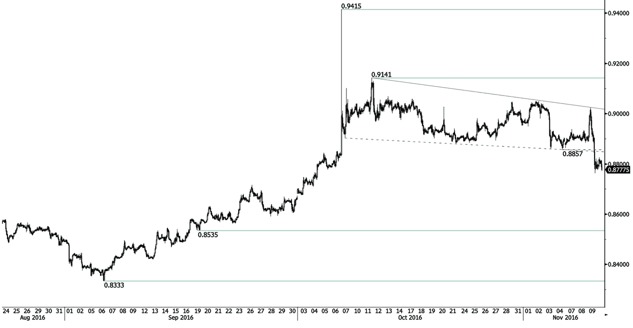 In the week ending November 11th the Euro fell from a post-election high at 0.9025 down to a close at 0.8607.