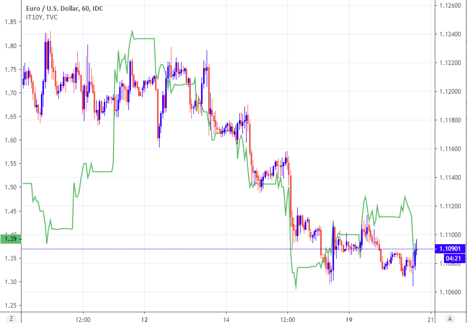 Above: EUR/USD rate, shown at hourly intervals, rises as IT 10-year yield (green line, left axis) falls.