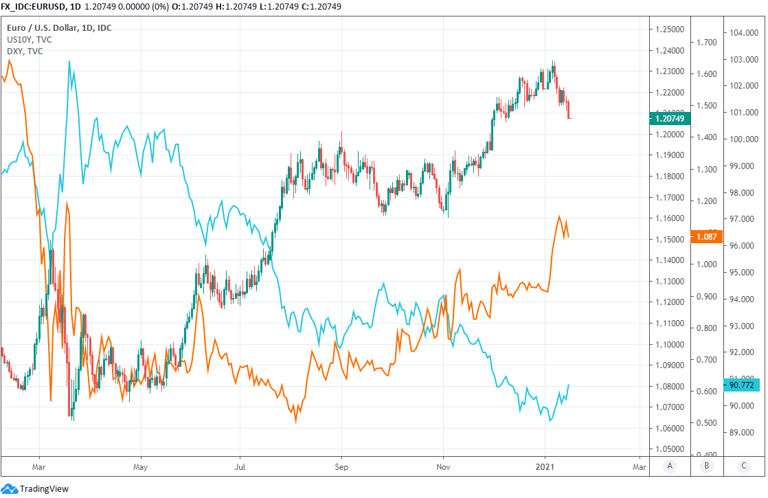 Above: EUR/USD at daily intervals with 10-year U.S. government bond yield (orange) and U.S. Dollar Index (blue).