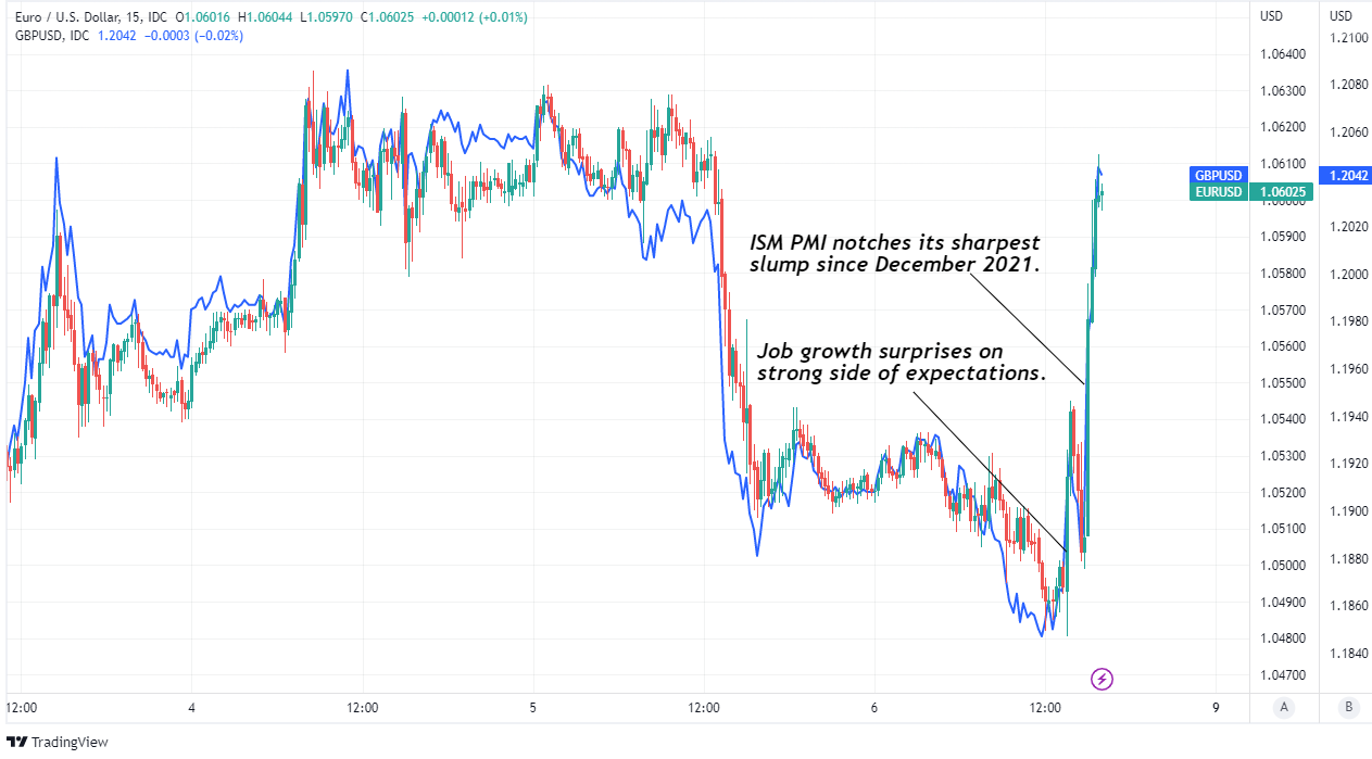 The Euro to Dollar exchange rate climbed sharply to recover the 1.06 level ahead of the weekend following a mixed bag of U.S. economic figures including another bumper non-farm payrolls report that was followed by a significant slide in an important indicator of activity in the services sector.