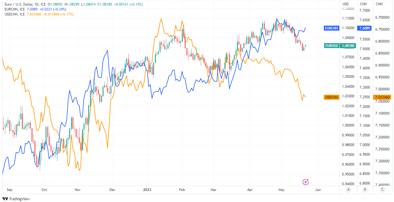 Above: Euro to Dollar rate shown at daily intervals alongside upside down Dollar-Renminbi rate and EUR/CNH. Click image for closer inspection.