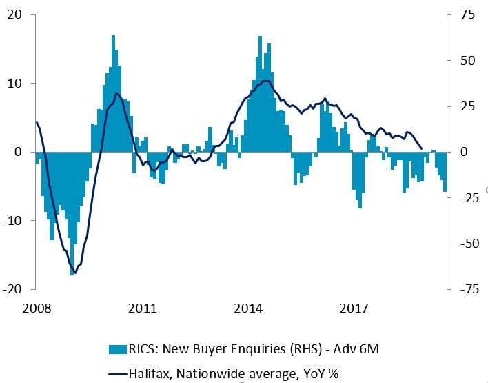 "UK house price inflation at 6-year low (+0.5% YoY) according to Nationwide. With new buyer enquiries remaining subdued the outlook for H1 2019 is that we'll see outright price deflation. Strength of labour market & mortgage afforability point to this being a policy-induced slowdown," says Simon French, Chief Economist at Panmure Gordon.