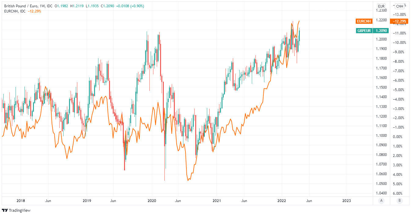 Above: Pound to Euro exchange rate shown at weekly intervals and alongside an inverted - upside down - EUR/CNH exchange rate. Click image for closer inspection.