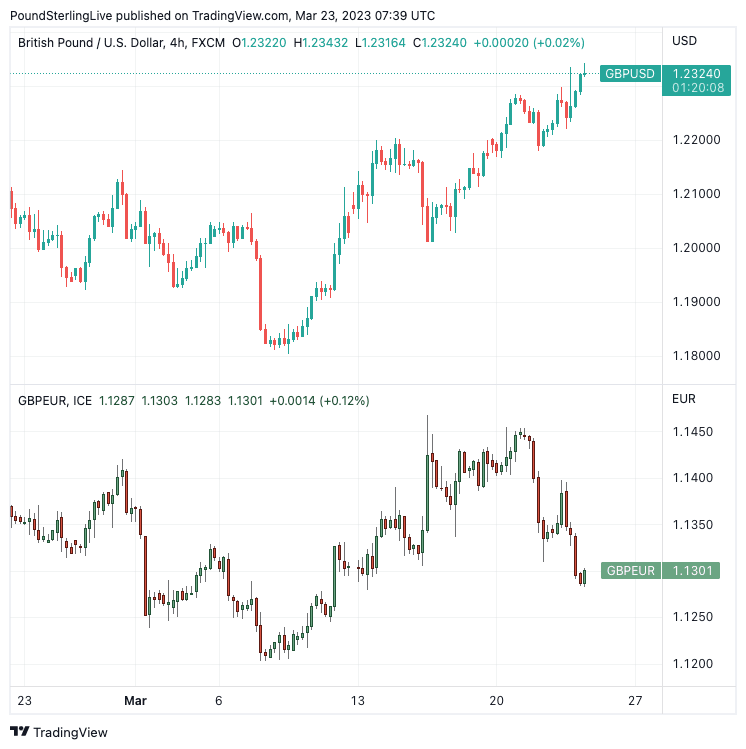 Above: GBP/USD (top) and GBP/EUR at four-hour intervals, showing recent price action ahead of the BoE decision. Consider setting a free FX rate alert here to better time your payment requirements.
